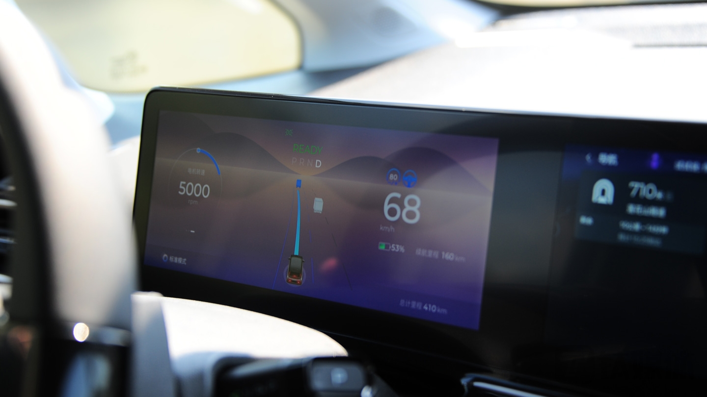全液晶仪表盘集成了驾驶模式、电机转速、续航里程、导航、娱乐显示等于一身。并且通过毫米波雷达还可显示周围其他车辆,科技感很足。