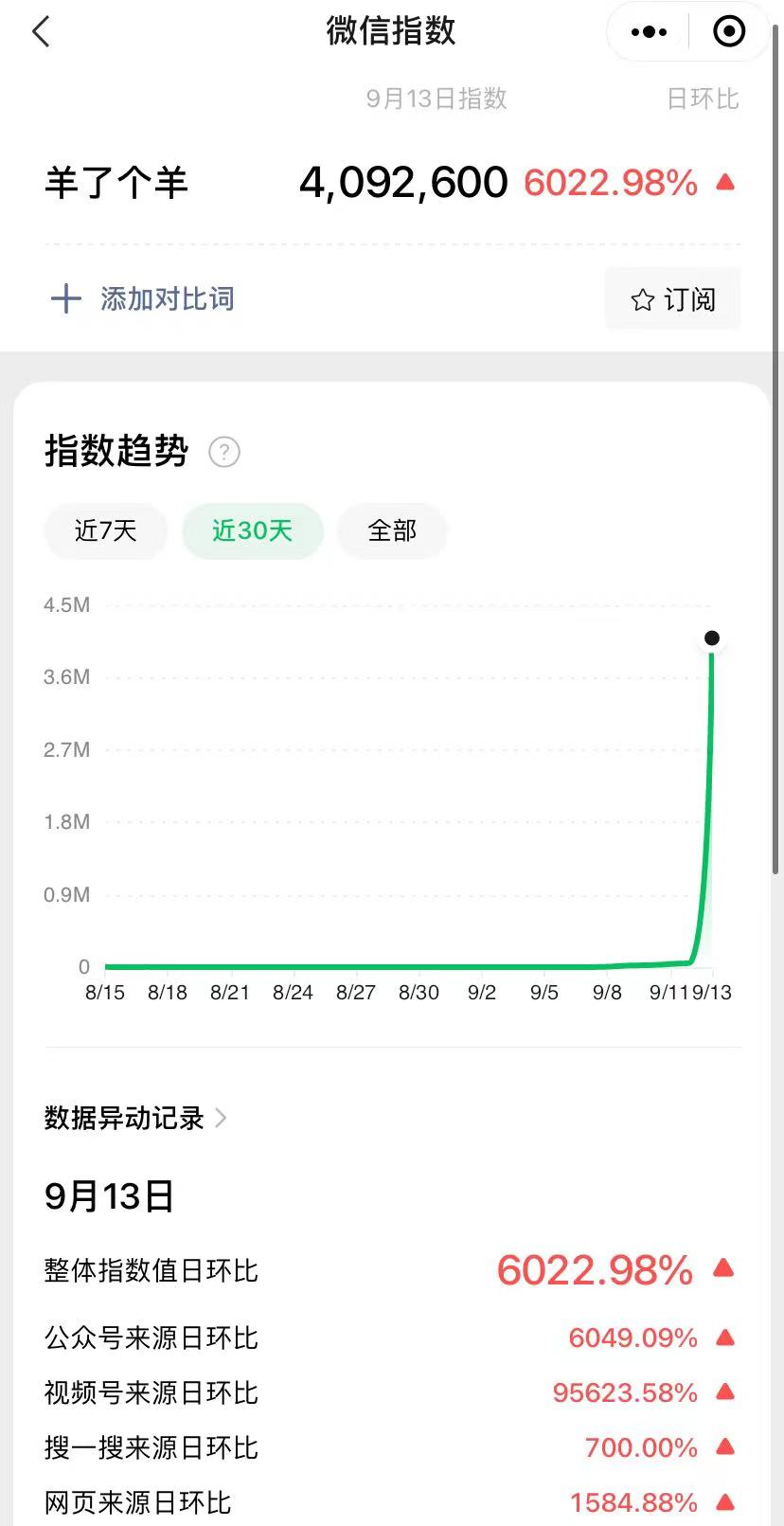 中秋假期结束后第一天,一款名为《羊了个羊》的微信小游戏空降热搜。据《羊了个羊》官博,游戏服务器两天崩了三次,超预期的收效促使官方“急招后端服务器开发,推荐/自荐入职奖励五千”。不完全统计,截至发稿前,#羊了个羊#相关话题拿到14个微博热搜,主话题阅读3亿次。9月12日到13日,《羊了个羊》的微信指数呈爆发式蹿升,9月13日环比上涨6022.98%。