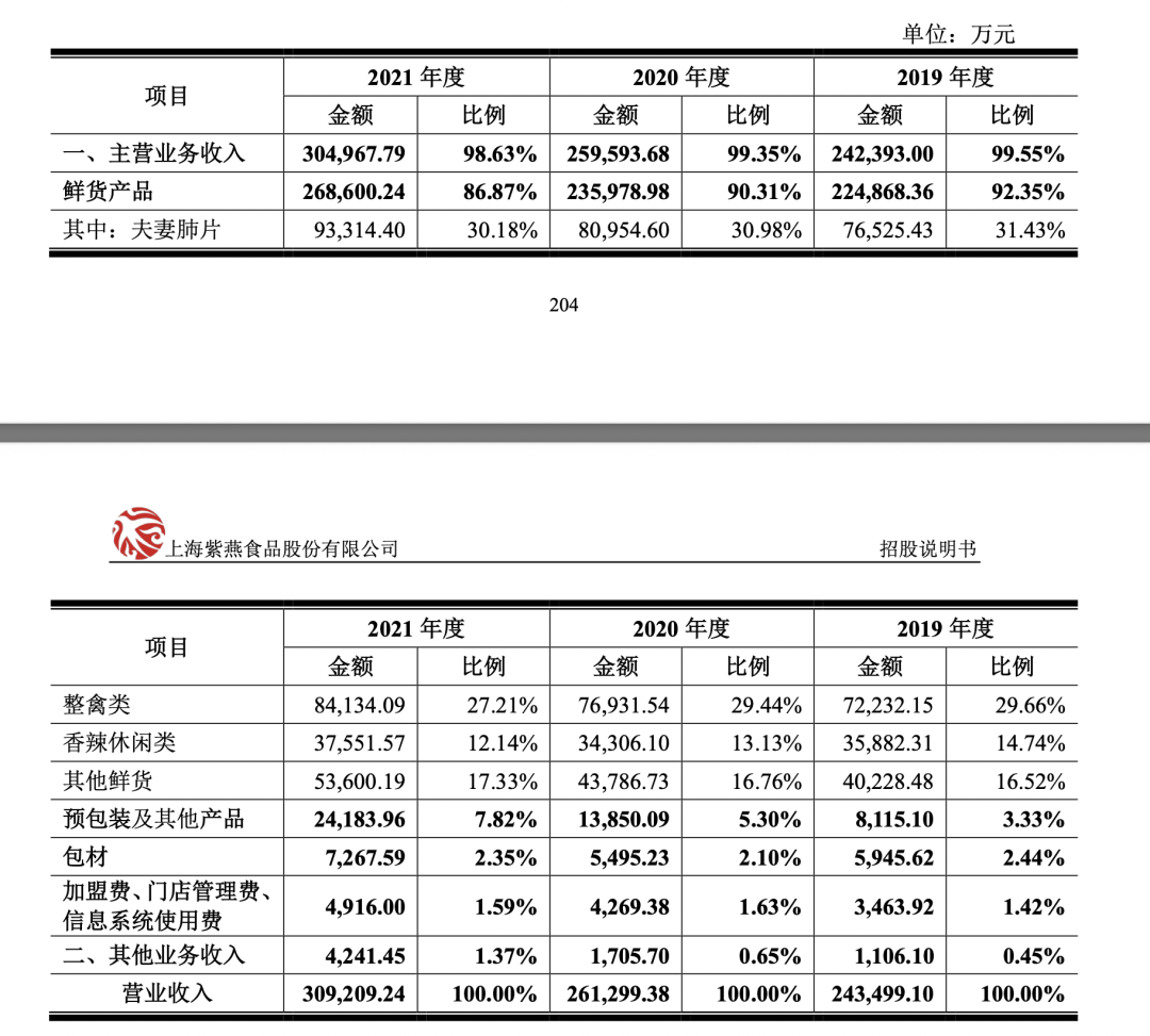 招股书显示,2019-2021年,紫燕食品营业收入分别为30.92亿、26.13亿、24.35亿元。其中,夫妻肺片作为公司的爆款产品,营收分别为9.33亿、8.10亿、7.65亿元,占总营收的比例稳定在30%以上。![]()