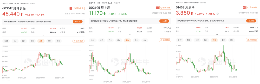 而老牌卤味企业在营收利润同比下降的同时,股价也开启了“腰斩”模式。截至9月15日收盘,绝味食品报45.44元/股,市值276.56亿元;煌上煌报11.17元/股,市值57.22亿元;周黑鸭报3.85港元/股,市值91.75亿港元(约81.68亿元)。