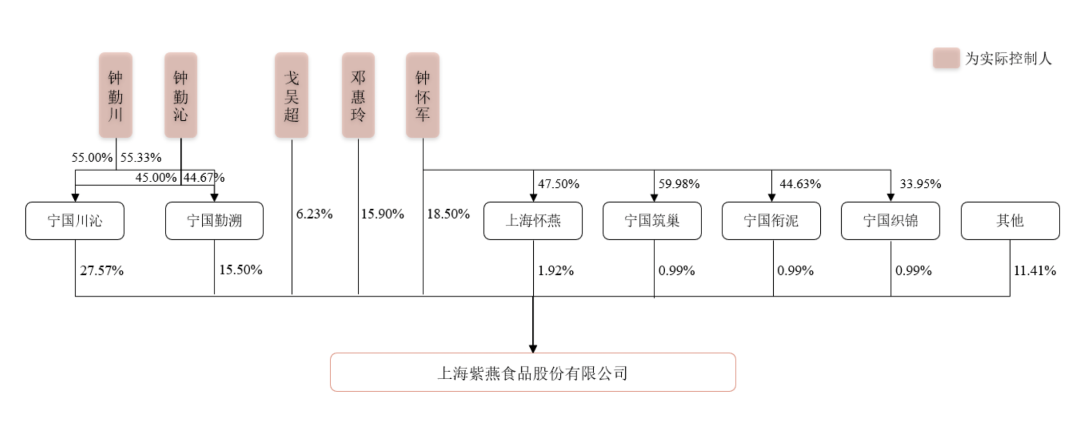 其中,B轮投资方嘉兴智潞持股1.62%,成为紫燕食品的最大外部股东,A轮投资方深圳聚霖成泽紧随其后,持股1.00%。招股书显示,钟怀军直接持股18.50%、间接持股2.28%,合计持股20.77%,并拥有23.37%的表决权;其配偶邓惠玲直接持股15.9%,其儿子钟勤川、女儿钟勤沁掌控的宁国川沁、宁国勤溯分别持股27.57%、15.50%,合计持股43.08%;钟勤沁的配偶戈吴超(钟怀军女婿)持股6.23%。