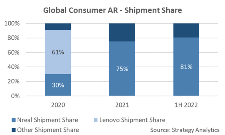 Nreal成为AR眼镜行业中不可小觑的新势力。据Strategy Analytics的报告显示,2020年到2021年,Nreal位居消费级AR头显出货量榜首,占了80%的市场份额。