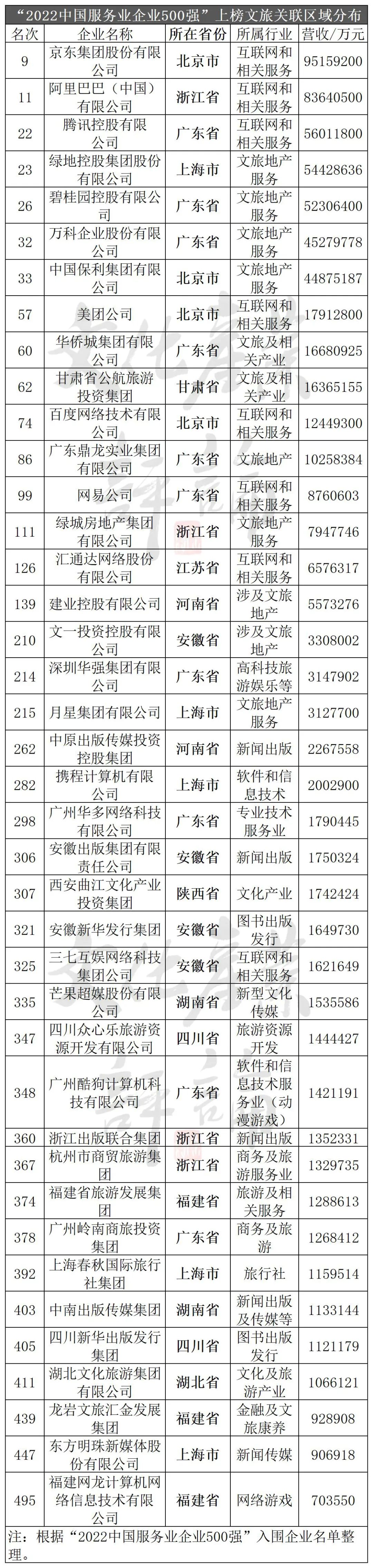 从“2022中国服务业企业500强”入围的文旅及相关企业结构看(详见下表),共涉5大类40家企业。其中,从事文化和旅游服务企业10家、互联网和相关服务企业7家、新闻出版和文化传媒服务企业8家、软件及信息技术服务企业5家、文旅地产和其他生活性服务企业10家(抽样选择)。![]()