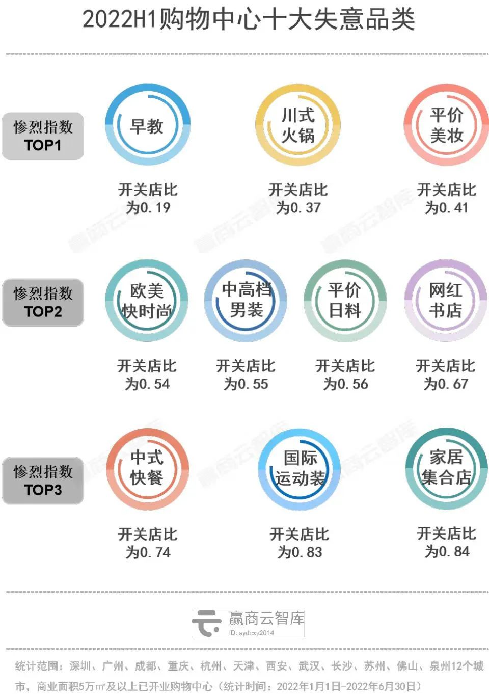 此前赢商云智库文章中总结“2022H1购物中心十大失意品类”中,0.47的开关店比夹在惨烈指数TOP1和TOP2。(本文的数据统计范围是重点7个城市,赢商云智库文章数据统计范围是重点12个城市,所以数据不完全相同。)