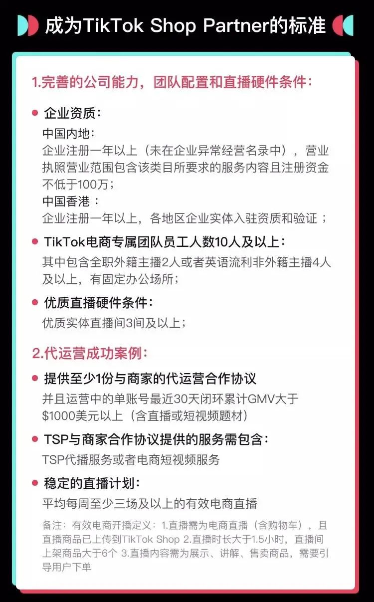 据TikTok Shop跨境电商官方发布的招募通知,中国公司成为TSP需要满足相应的团队配置,比如包含2位全职外籍主播,或4位及以上英语流利非外籍主播;同时还需具备成功的代运营案例经验,比如近30天累计GMV超过1000美元等。