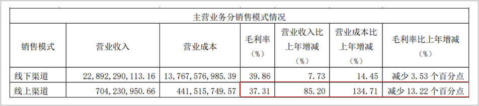 据统计,近年来海天味业线上渠道毛利率一直处于下降趋势。从2019年最高54.63%降至2021年的37.31%,已经低于线下渠道的39.86%。