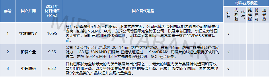 国内硅片企业像沪硅产业、立昂微等凭借在大尺寸硅片的技术积累以及产能优势,在营收端逐渐与其他硅片公司拉开差距,其中沪硅产业的硅片产品基本实现了逻辑、存储、图像传感器(CIS)等领域的应用全覆盖;立昂微在外延技术的研究方面也取得了不错的成果,其12英寸重掺外延片实现突破放量。虽然目前国产头部硅片企业与信越化学、SUMCO等国际硅片巨头还存在差距,但也稳稳占据第二梯队。