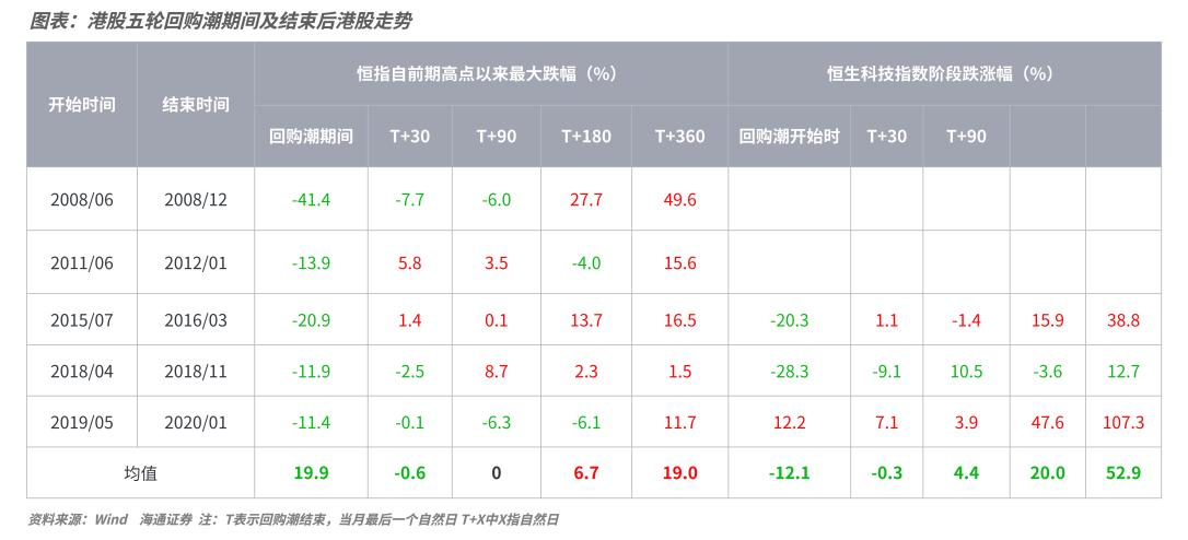 海通证券研究显示,2005年以来,港股共经历五轮回购潮,均在市场大幅下跌和估值处于低位时开启。但历次回购潮之后港股往往企稳回升,后续恒生指数和恒生科技指数均能带来较好的回报,1 年后平均累计涨幅分别为 19.0%和 52.9%。