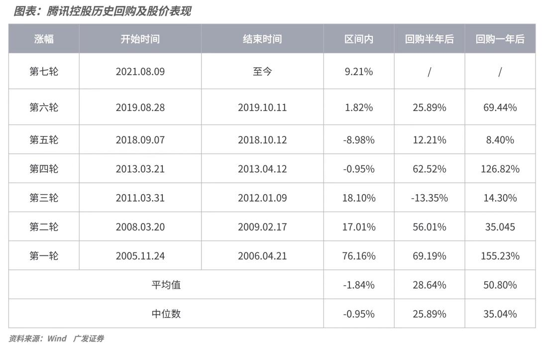 具体到个股,以腾讯为例,广发证券统计数据表明,其历史上总共发起过7次回购。