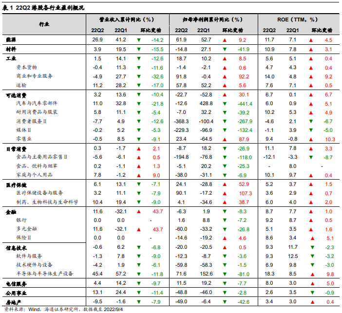 在基本面上,据港股上市公司披露的2022年中报,能源板块营收、盈利增速最优,软件与服务板块受挫最重。恒生科技股净利润增速更是由2021H2的-16.8%,下降至2022H1的-37.0%(光大证券)。