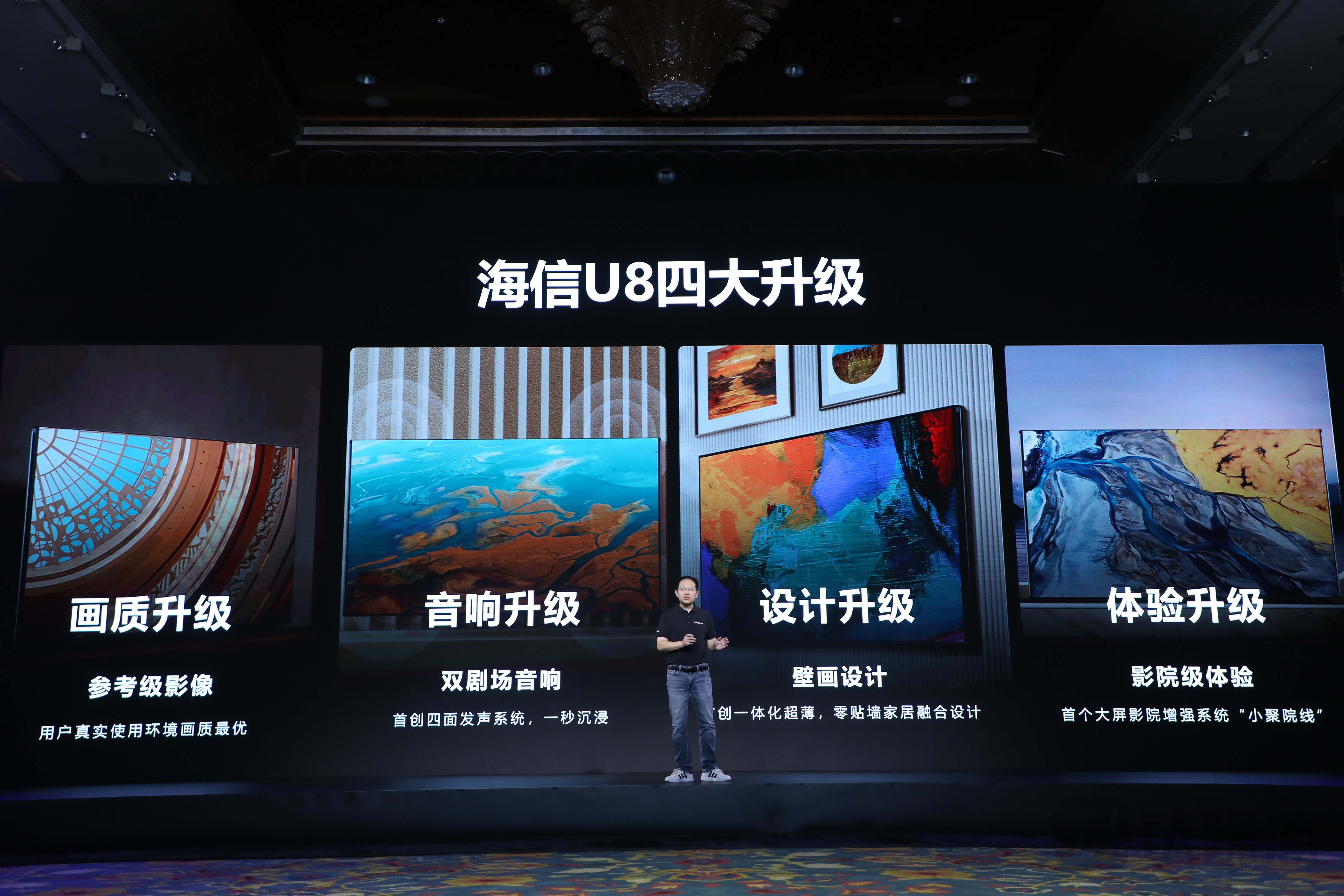 据海信电视产品经理李敏华介绍:“U8H是海信基于ULED X全新显示技术平台的代表作,在画质、音响、设计、体验四个方面都做了全面提升,包括参考级影像、双剧场音响、零贴墙壁画设计、小聚院线影院级体验等,是行业首个用户真实场景下画质体验最好的参考级产品。”