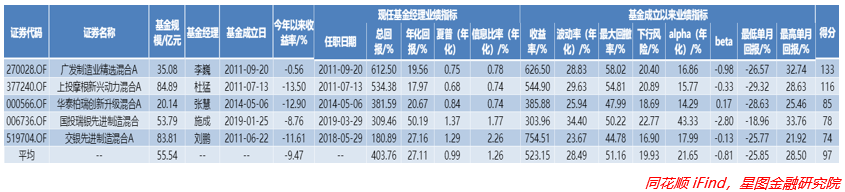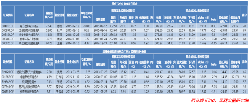 2)基金比较基准中不包含以上指数,但是基金名称中包含“高端制造”、“先进制造”、“高端装备”、“智能制造”、“智能装备”、“制造业转型”、“中国制造2025”、新经济、产业升级、转型等关键词的基金。除此之外,选取成立时间超过两年、基金规模大于1.5亿,自成立以来收益率大于0、投资类型为权益型基金(普通股票型、灵活配置型、偏股混合型,下同),若同一位基金经理入选多只基金则保留成立年限较长的基金,A/C类基金只保留A类基金,最后根据所选指标按照权重打分,选出5只最优秀的基金作为研究标的。