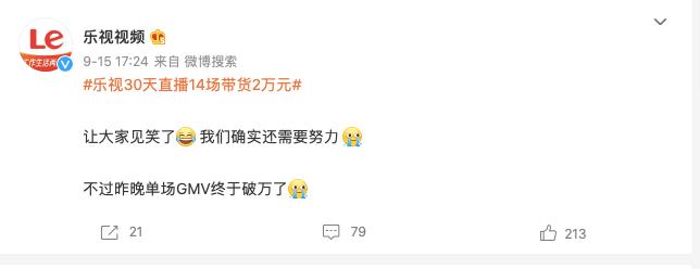 9月15日,“乐视30天直播14场带货2万元”的消息冲上热搜,引发网友热议。对此,乐视视频发文回应称”让大家见笑了,我们确实还需要努力,不过昨晚单场GMV终于破万了。”
