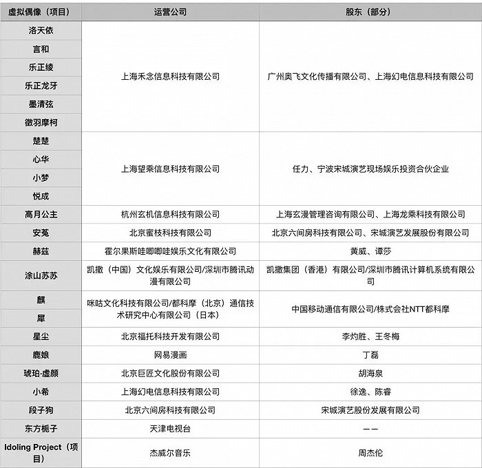 国内虚拟偶像名单(部分),数据来源:天眼查
