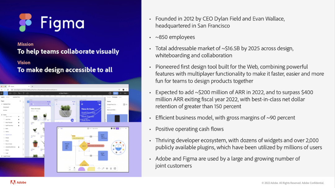 Adobe CEO山塔努·纳拉延(Shantanu Narayen)认为:“Figma 的产品吸引了数百万用户,其增长速度、业绩表现和盈利水平都是SaaS公司中非常少见的,而Adobe 需要 Figma 的增长和用户群来保持公司在设计领域的主导地位。”