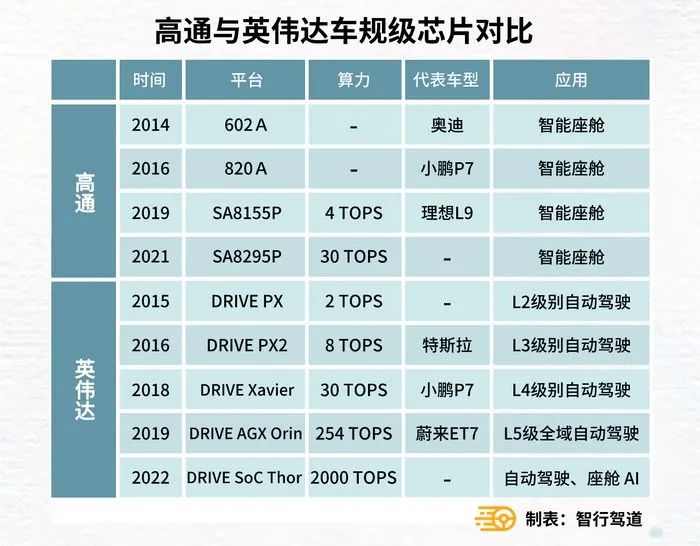 事实上,早在2014年,高通、英伟达便敏锐地嗅到汽车智能化中的商机,抢先布局车载芯片,占据市场先机。