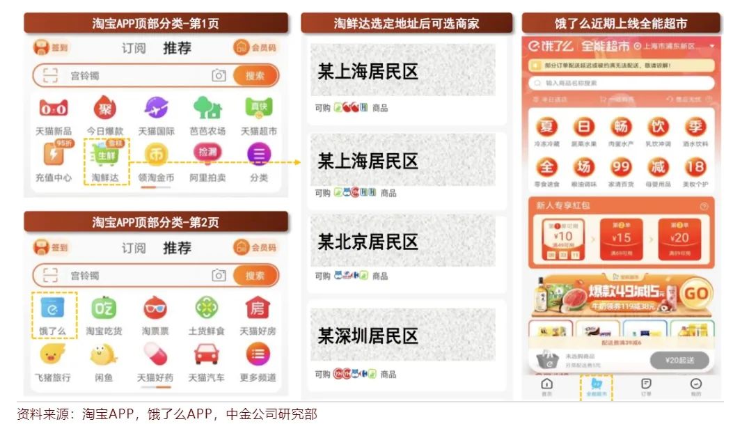 阿里同城零售则是淘鲜达、盒马、高薪零售混合打法,主站有足够大的用户流量,但并未对同城零售业态进行充分导流。