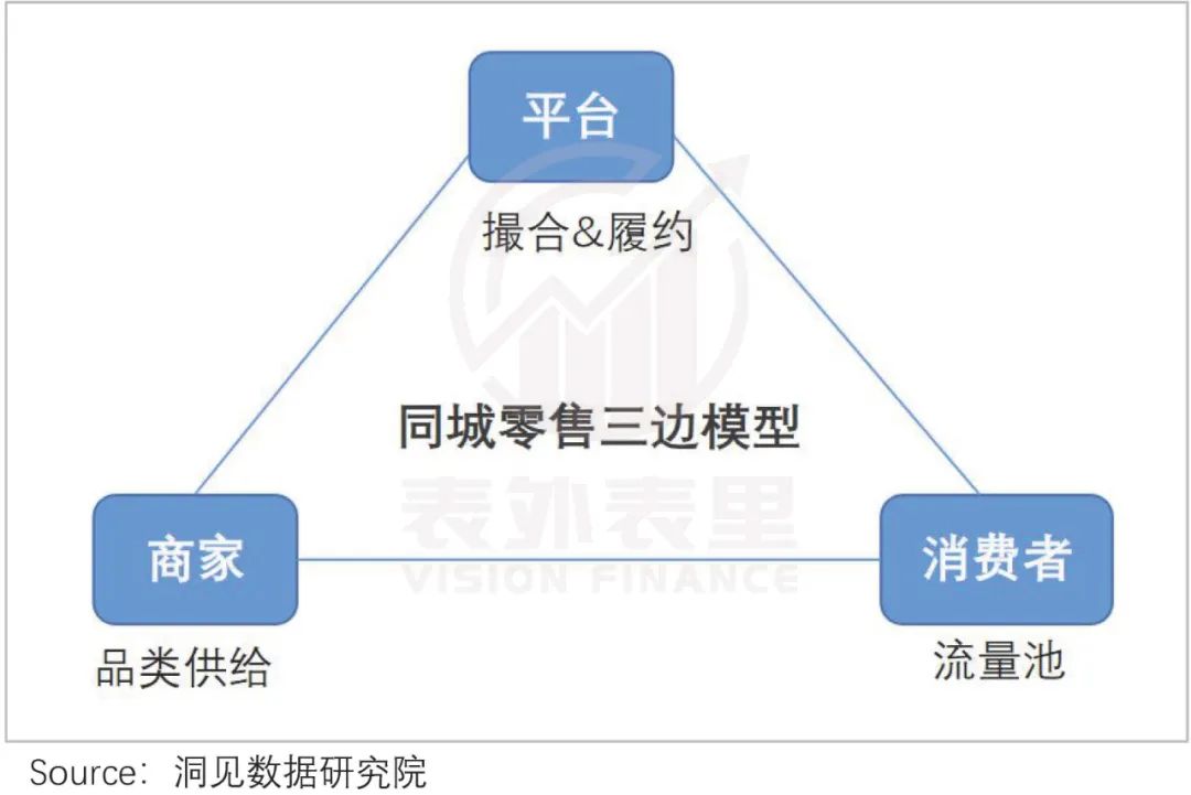 同城零售本质上解决的还是“给用户送东西”的需求,仍属于线上零售的范畴。其核心商业模式与传统电商(非自营)大差不差,无外乎商家供给、履约网络、用户流量三边网络。