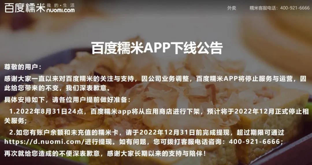 9月20日,百度糯米发布APP下线公告,因公司业务调整,APP将停止服务与运营,APP已于8月31日从应用商店下架,并将于2022年12月正式停止相关服务。