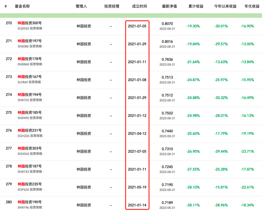 另外一个“污点”,就是近期林园被质疑的关键问题:有小部分基金出现了比较严重的浮亏情况,并且持续了一段时间。可以发现,这些亏损幅度较大的基金,基本上都是成立于2021年上半年的。