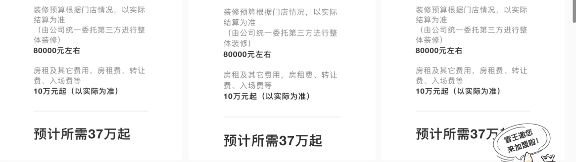 蜜雪冰城官网显示,加盟费用按照城市等级划分开来。县级城市每年收取7000元,地级市9000元,省会城市则是11000元。此外,加盟商开店需要交2万元保证金,8万元左右买设备、8万元左右的装修费用,以及6万元起的原材料采购费用,加盟一家门店前期预计投入在37万元起。