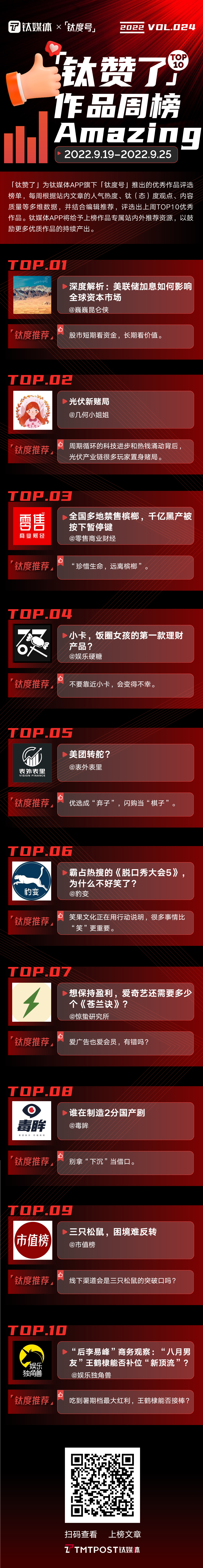 2022年9月19日—9月25日,「钛赞了」榜单第24期上榜作品为: