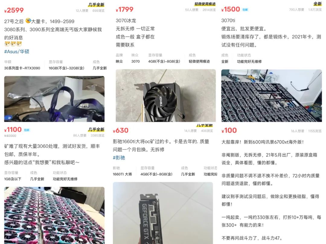 《中国企业家》搜索发现,这类矿卡已经流入二手市场,标价3080为1999元;3090为2599元;3070为1599元;3060为1099元。还有不少收此类矿难卡的则按照200~500元的标准收购中。