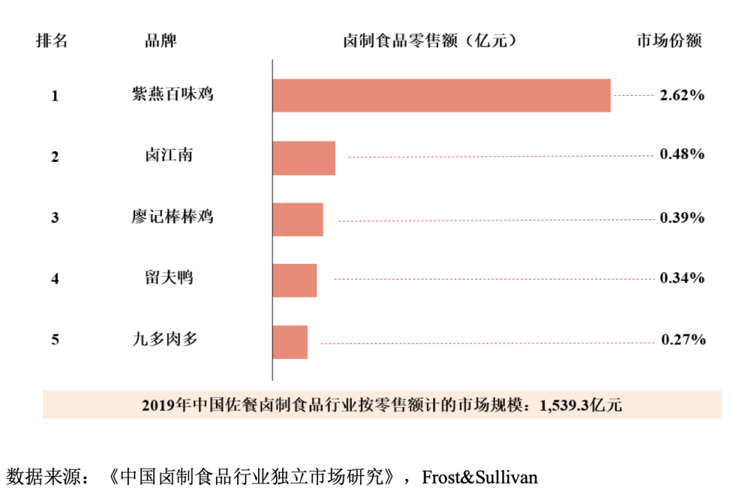 但在佐餐卤制食品市场,紫燕食品自称是“老大”。招股书显示,2020年,紫燕食品在国内卤制食品市场零售端的占有率约为1.48%-1.84%,在国内佐餐卤制食品行业前五大品牌中排名第一。