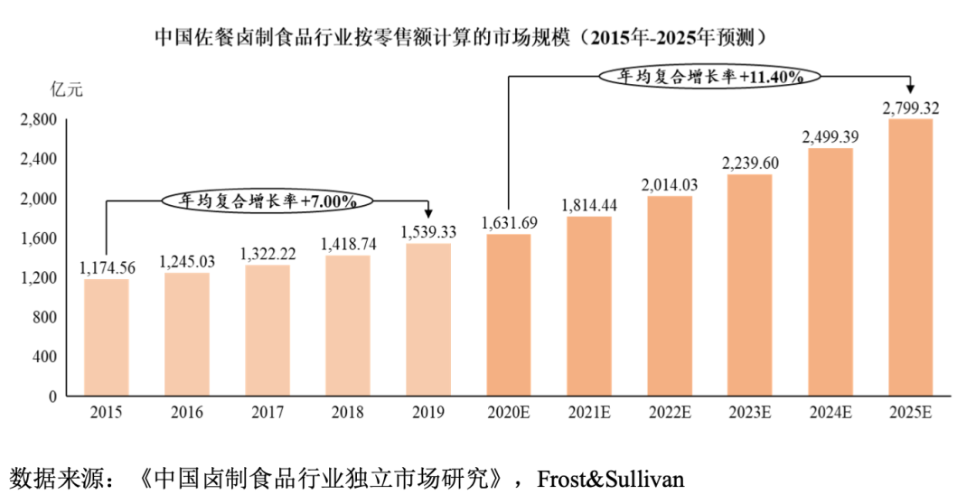 如今,休闲卤味和佐餐卤味各占卤味赛道半壁江山。据CBNDATA数据显示,2021年佐餐和休闲卤制品的行业规模分别为1792亿元和1504亿元。据Frost&Sullivan预测,佐餐卤制食品行业市场规模预计2025年能达到2799.32亿元。