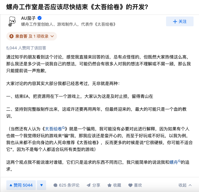 旁人的观点,茄子自己并非不懂。在2020年5月,他就在知乎回复过“螺舟工作室是否应该尽快结束《太吾绘卷》的开发?”的问题,在当时封闭开发的公告刚刚发出。而在读娱君看来,茄子当时的文字其实已经解释了螺舟大方向上的所有选择: