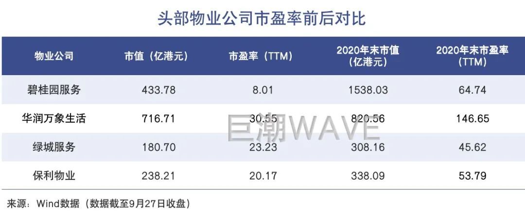 高估值之下,多家上市物业公司市值曾经阶段性超过其地产开发业务的上市资产,如碧桂园服务2020年的营收还不及碧桂园的4%,去年8月的市值却一度超越了碧桂园,对应市盈率高达65倍PE(TTM)。