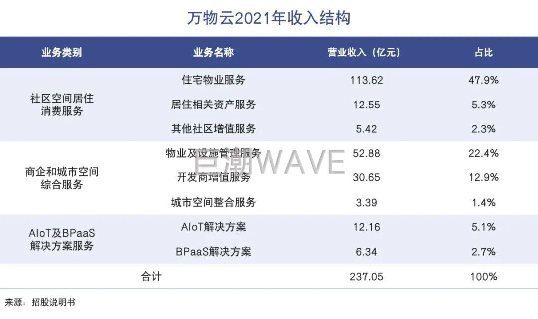 据万科半年报披露,2022年上半年,万物云实现营业收入143.5亿元;其中社区空间居住消费服务收入80.8亿元,占比56.3%,商企和城市空间综合服务收入51.1亿元,占比35.6%;AIoT及BPaaS解决方案服务收入11.6亿元,占比达到8.1%。