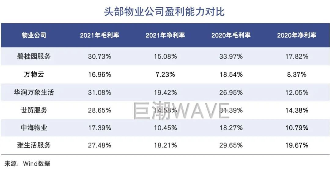 但按照万物云的招股书显示,自2019年至2022年前三个月,其毛利率分别约为17.72%、18.54%、16.96%、14.73%及14.47%。在头部的物业上市公司中,万物云的毛利率反而较同行低了不少。