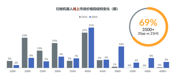 据 GfK 数据显示,今年上半年,在整体家电市场低迷的大环境中,清洁机器人市场零售额达 145 亿元,仍保持着同比 14.0% 的增速,同时单品 3500 元以上价格段市场继续扩容,今年上半年线上线下市场均价分别为 3163 元和 4048 元,与去年相比分别上涨了 768 元和 1193 元。