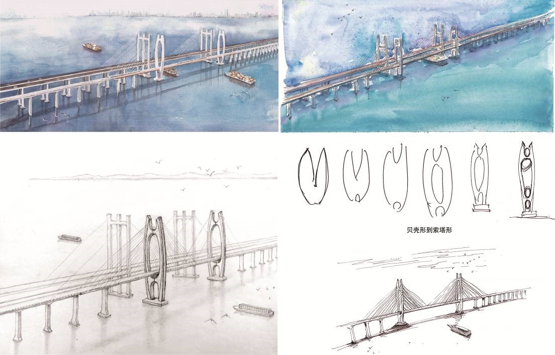 泉州湾跨海大桥手绘图及方案构思演变(图源:铁四院严爱国团队)