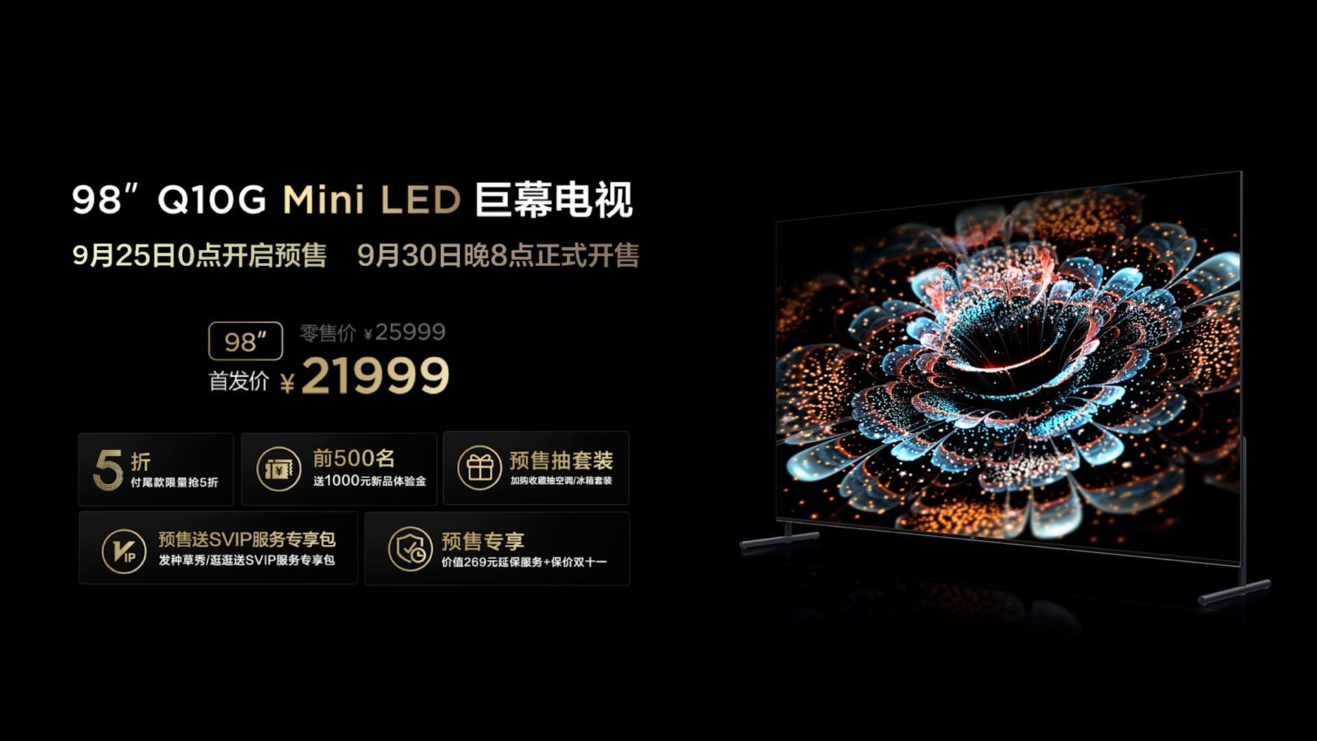 钛媒体App9月28日消息,TCL推出98英寸Mini LED电视新品TCL 98Q10G,首发价为21999元,98Q10G Mini LED电视也成为Q10G系列的新增产品。
