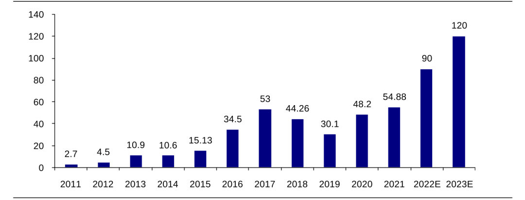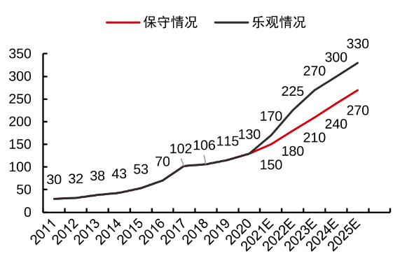 2022年预计全球光伏新增装机超过220GW,同比增速30.4%。2021-2025年,乐观的光伏装机需求CAGR约20%。也就是说,在未来5—10年的装机需求上,前景是没有问题的。