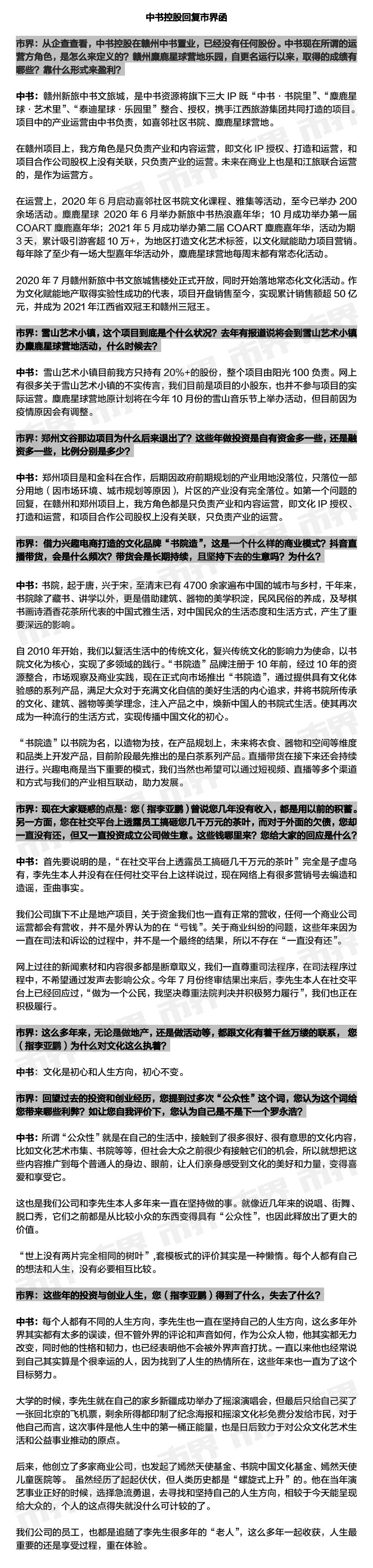 作为赣州文谷的住宅配套,赣州新旅中书文旅城从销售至今,尽管累计销售额可观,但其主体公司赣州中书资源置业,在这些年股权几经变迁。据企查查显示,李亚鹏方从早期投资持股45%,到现在已经与赣州中书置业股权上没有关联。李亚鹏方也再三强调说,“在赣州和郑州项目上,我方角色都只是负责产业和内容运营,即文化IP授权、打造和运营,和项目合作公司股权上没有关联”。