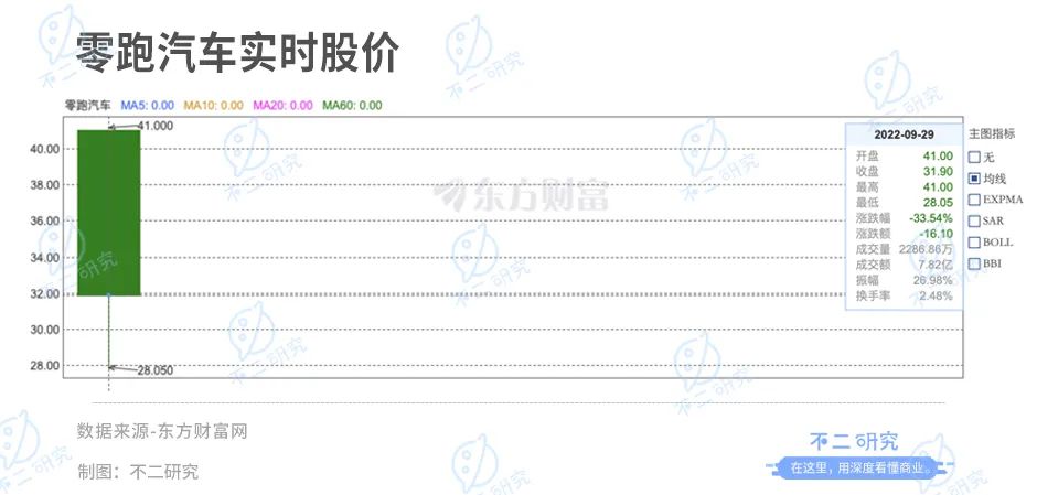 截至9月29日港股收盘,零跑汽车报收31.90港元/股,跌幅达33.54%,对应市值364.5亿港元(市值折合人民币约为334.2亿元)。