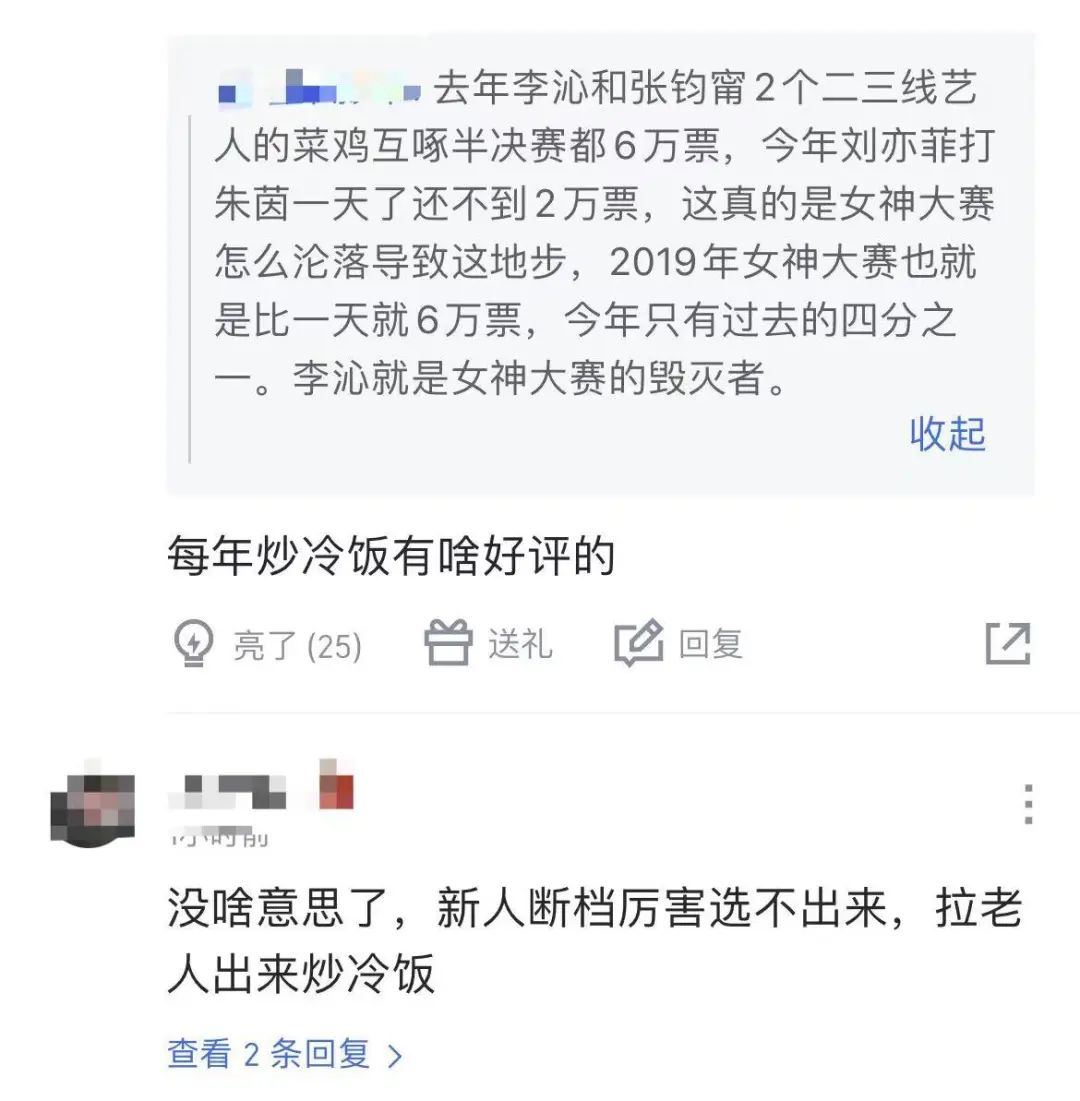 《超级女声》是更侧重于歌手选拔的综艺,歌唱实力是第一评价体系,颜值本身就是相对后置的。加之当年的造星产业野蛮生长,许多曾红极一时的选手后续都“星途不顺”,并未收获足够的曝光度,事到如今仍能叫得上名字的明星并不多。在今年的虎扑女神大赛上,来自《超级女声》的“女神”仅刘惜君一人在列。
