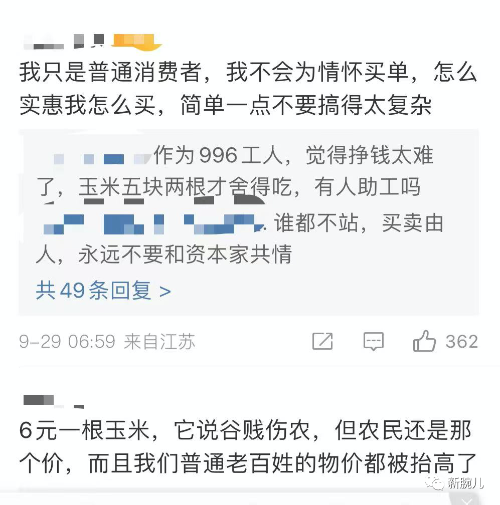 我们在微博看到,公众已经开始对助农直播间内的高价农产品表达不满的情绪。“我只是普通消费者,我不会为情怀买单,怎么实惠我怎么买,简单一点不要太复杂。”、“6元一根玉米,它说谷贱伤农,但农民还是那个价,而且我们普通老百姓的物价都被抬高了”