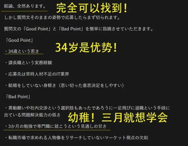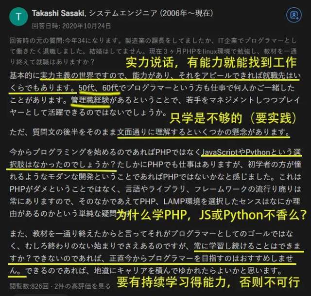 日本网友主流的回复是,在日本34岁想转行做程序员,有实力就行,年龄不是问题。程序员是可以干到退休的,技术为王,50后、60后的程序员也是很多的。高赞网友的回复是,34岁、有管理经验、未婚都是是优势!关键是IT行业很缺人!