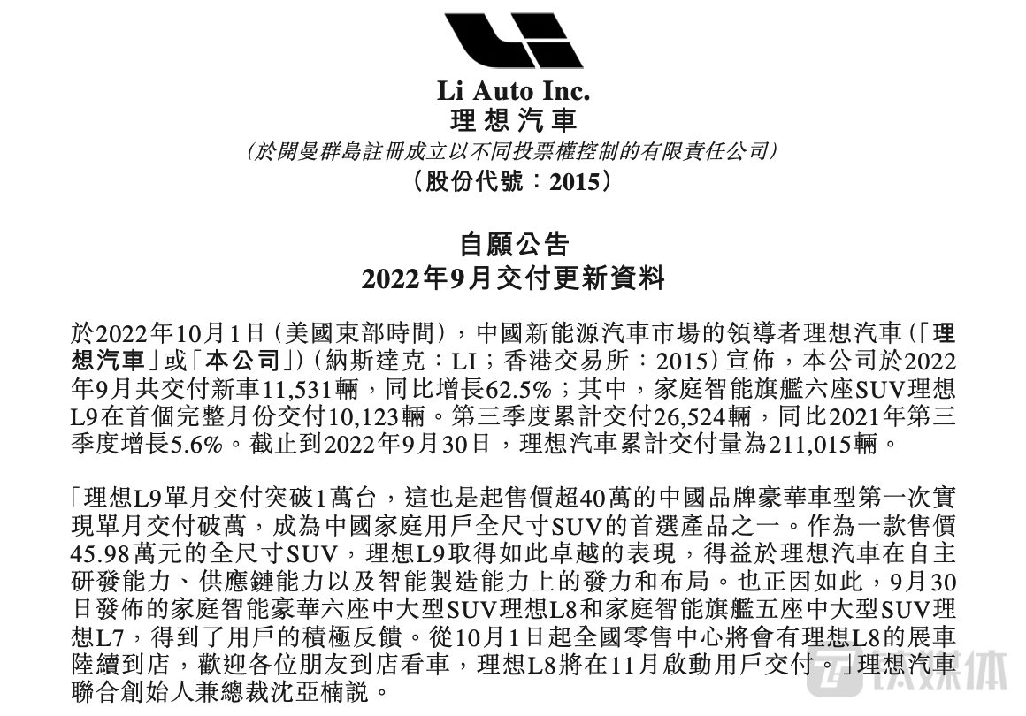 在理想汽车于10月1日公布的九月交付数据中,第三季度累计交付26524辆,同比增长5.6%,高于此前公布的2.55万辆的最新交付指引数据,但与最初的2.7万辆至2.9万辆交付指引数据相比存在一定差距。