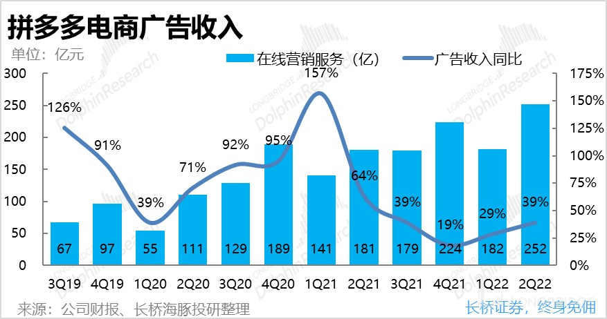 以拼多多最关键的电商广告收入来看(同时排除多多买菜和自营收入变动的影响),自 4Q21 营收增速达到低谷后,已连续两个季度加速上涨。而最让人惊叹的是,在二季度国内疫情影响下,多多反而逆势取得了广告营收 39% 的增长(同期阿里负增长 11%,京东也仅增长 9%)。