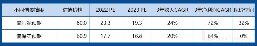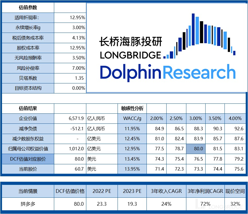 基于上述保守情形下的财务预测,我们根据 DCF 模型估算出拼多多的合理估值在 770 亿美元,对应每股股价在 $60.9。从相对估值角度,对应 2022 年 17.7x P/E,2023 年 337 亿净利润的 16.8x P/E。