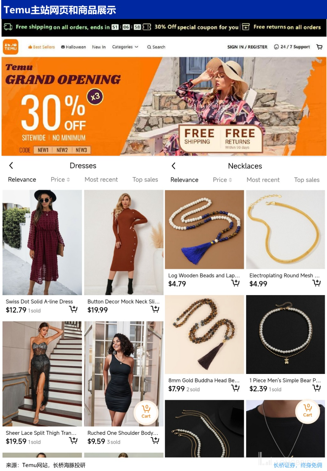 从商品定位上,Temu 也延续了 Shein 和 Shopee 成功背后的极致性价比定位。当前主要以单价在 $20 以内的服装配饰等为主,不过据公司沟通,Temu 的定位是全品类平台。而在初步获客阶段,Temu 对新用户提供全场 30% 的折扣,并暂时为金额超过 $49 的订单免收运费。