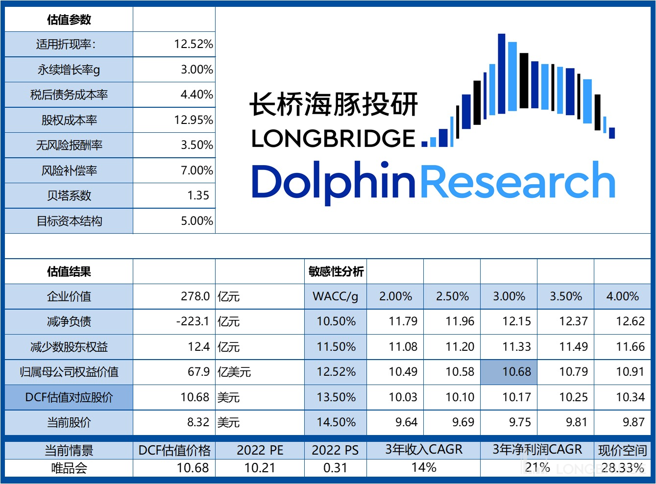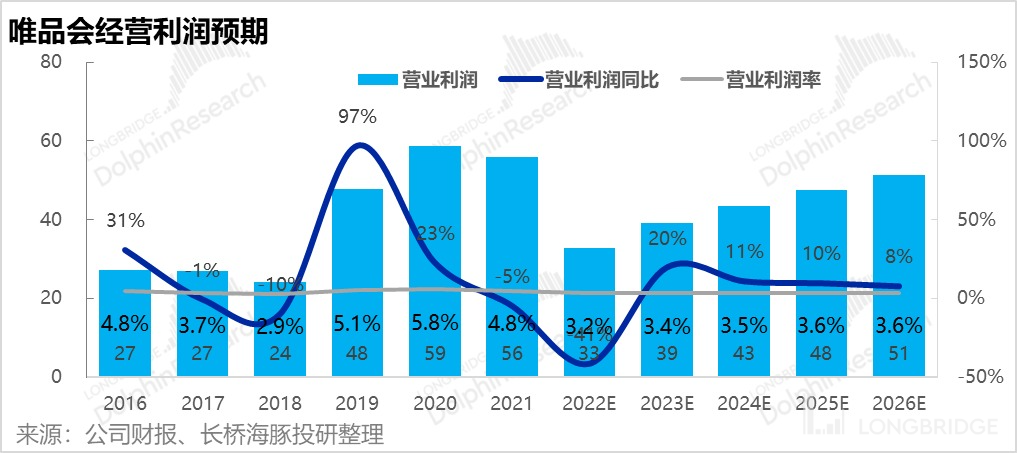 经营利润率上,海豚君的远期估算还是比唯品会自己的估计保守不少:唯品会主要目标是希望走出疫情后,通过毛利率管理把经营利润率维持在 5% 以上。
