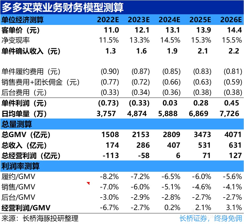 落实到财务模型上,考多多买菜已经领跑社区团购市场,我们上调了对多多买菜的预测。预计到 2026 年能实现约 4000 亿的 GMV 规模,并贡献约 130 亿的经营利润,对应买菜业务的经营利润率(比 GMV)会从,22 年的-7.5%,优化到 2026 年的 3.1%,对应件单盈利四毛五(横向对比来看,京东自营商超的稳态的经营利润率应当在 4% 左右。)