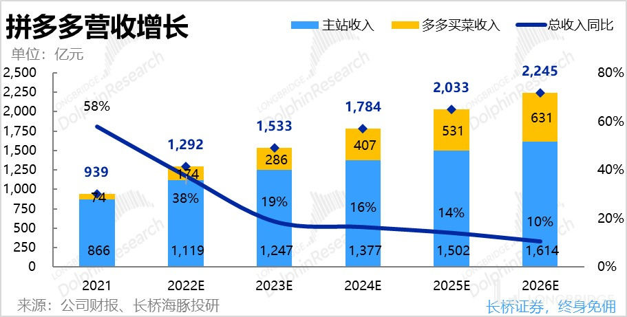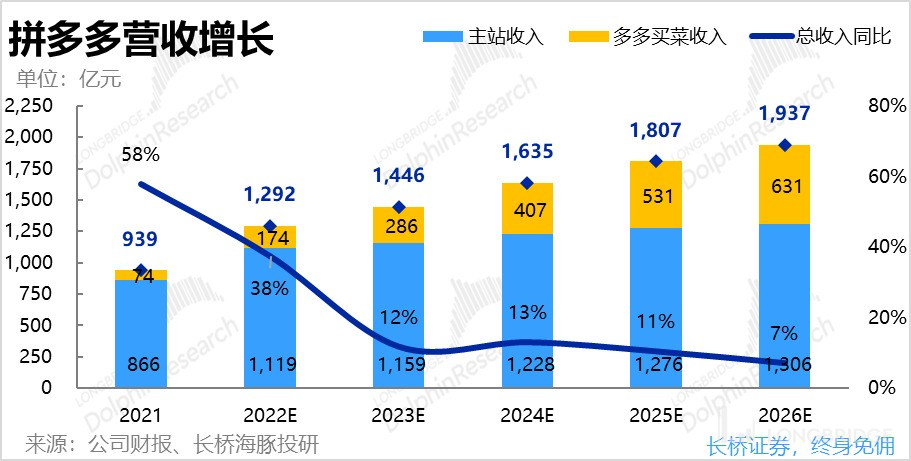 ③不过,考虑到拼多多的用户渗透见顶,而客单价由于无法向上突破品牌和品质电商,难以上行,假设价格增长与 CPI 同速,因此预计 2023-2026 年拼多多的总营收增速会从 19% 快速下降到 10%。