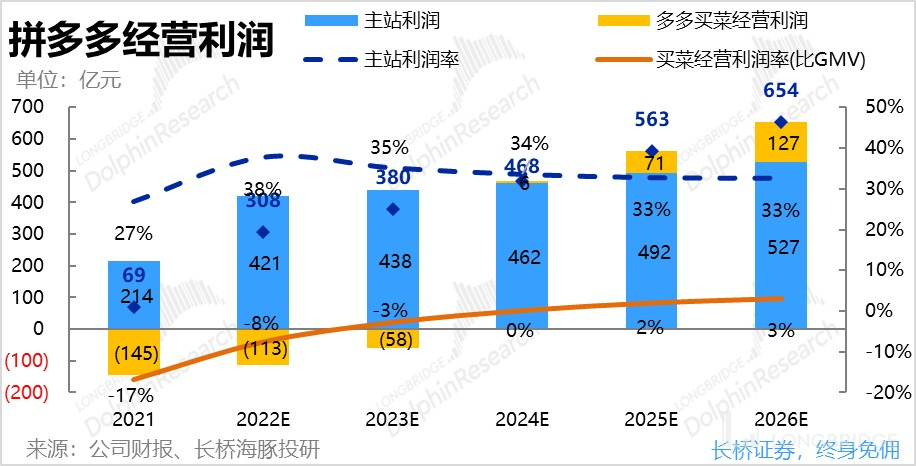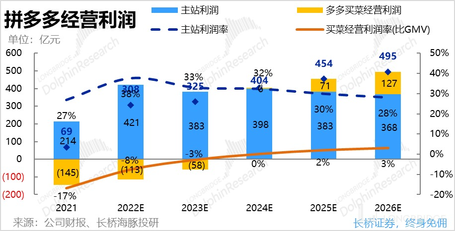 在此情境下,预计 2025 年拼多多能实现约 454 亿的经营利润,其中主站能贡献 383 亿利润,对应 30% 的利润率,多多买菜盈利的预测与先前相同。